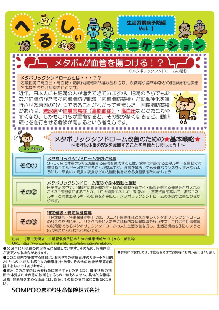 へるしぃコミュニケーションVol.1 生活習慣病予防編 2025年2月25日 『いかがお過ごしですか?人生100年時代と言われている中で、みなさまに元気で健康に過ごしてもらえるようヘルスケアに対する理解を深めていただく機会を提供できればと思い、定期的に情報発信をさせていただきます。 今回は、「メタボリックシンドロームの危険性」をご案内します。「最近お腹周りにお肉ついてきたな・・・」「健康診断で、腹周り指摘されてしまった」そんな悩みを持つ方も多いのではないでしょうか。まずは正しい知識を持ち、意識することから始めてみませんか?』